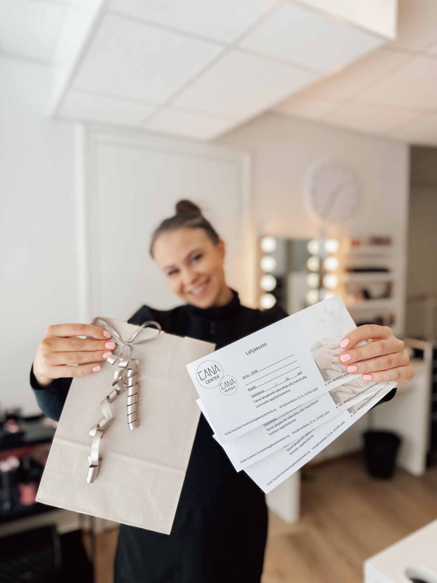 Lahjakortit ovat helposti ostettavista verkkosivuiltamme https://booksalon.fi/eana-center/gift-cards/step/1 tai voit tulla meille paikan päälle hoitolalle ostamaan lahjakortin. Jos ostat lahjakortin verkossa sen voi suunnata haluamallesi summalle ja voit kirjoittaa siihen vapaavalintaisen tekstin kuten "Tässä sinulle hemmottelua lahjaksii: luxuskasvoito, olet sen ansainnut". Paikan päältä lahjakorttia ostaessa voit ostaa sen haluamallesi summalle tai tiettyyn hoitoon ja saat matkaasi mukaasi fyysisen lahjakortin.